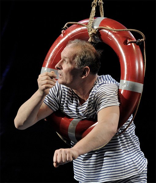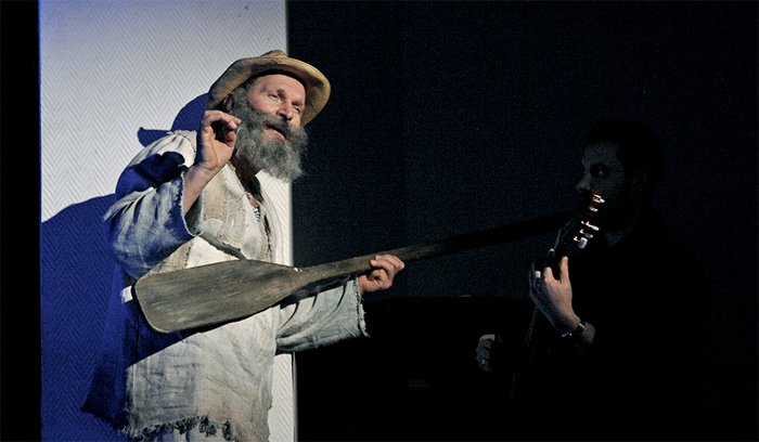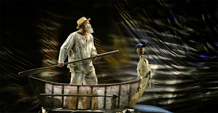 Желаемого эффекта ему помогают добиться искусно вплетённые элементы акробатики, музыкальное и световое оформление спектакля. Налёт романтики всему происходящему придают и элементы сценографии – покрытие сцены, постепенно превращающееся в огромные мрачные волны, рыболовные снасти, остов громадной рыбы.