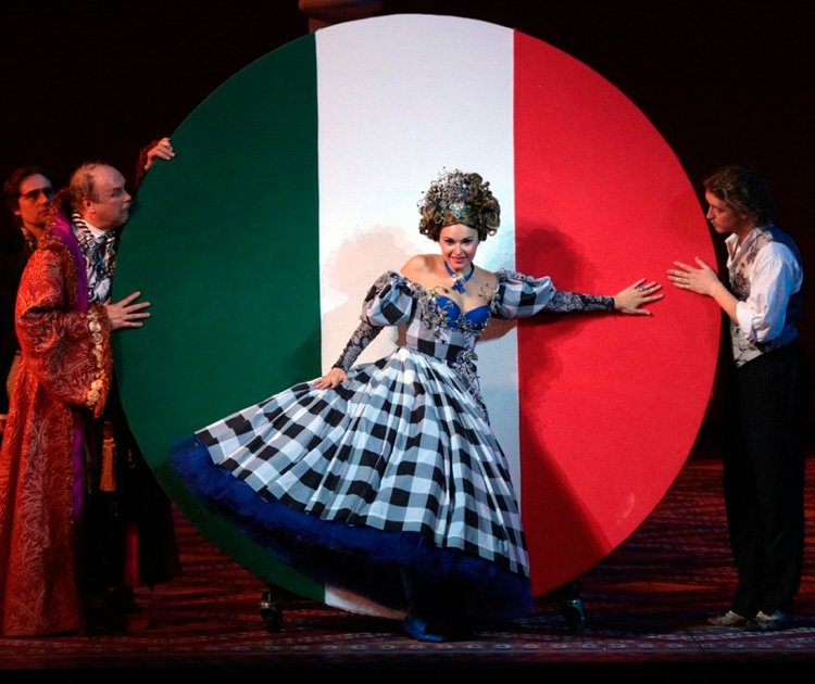 "Итальянка в Алжире", названная Стендалем "высшим достижением жанра буффа", была написана Россини в 1813 году. Премьера в венецианском театре "Сан-Бенедетто" состоялась 22 мая 1813 года. Довольно быстро завоевав Европу, "Итальянка" в 1822 году оказалась в России, где в Москве в театре на Знаменке ее поставила итальянская труппа. Затем сценическая история этой оперы в России остановилась без малого на двести лет, пока партитуру Джоаккино Россини не освоил санкт-петербургский театр "Зазеркалье". Зато опера звучала на российских концертных подмостках. Художественным событием было исполнение партии Изабеллы Зарой Долухановой, выступившей в концертной версии оперы в 1955 году в Колонном Зале. А в 2010 году "Итальянкой в Алжире", исполненной на сцене Большого зала Московской консерватории продирижировал знаменитый россиниевский маэстро Альберто Дзедда. И вот теперь сценическая версия оперы Россини появилась в Музыкальном театре им. Станиславского и Немировича-Данченко.