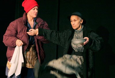 По помосту спускается баба в трениках, закатанных до колен, и с сумками. Оттуда извлекаются трехлитровые банки с огурцами-помидорами и винегретом. Та, что в трениках, пытается в грубой форме насильно накормить ту, что в длинном платье, с виду вполне вечернем. Та ни в какую — отказывается принимать пищу. Ситуация абсурдная, и текст Людмилы Стефановны, кстати, присутствовавшей в тот вечер в зале, не менее странен: игра в прятки — только словами.