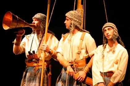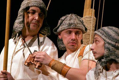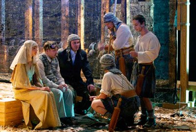 Удивительными и оригинальными являются и декорации. Всю сцену занимает конструкция из верёвок, канатов и палок, между которыми бродят воины в вязаных шлемах и ведут размеренные диалоги.