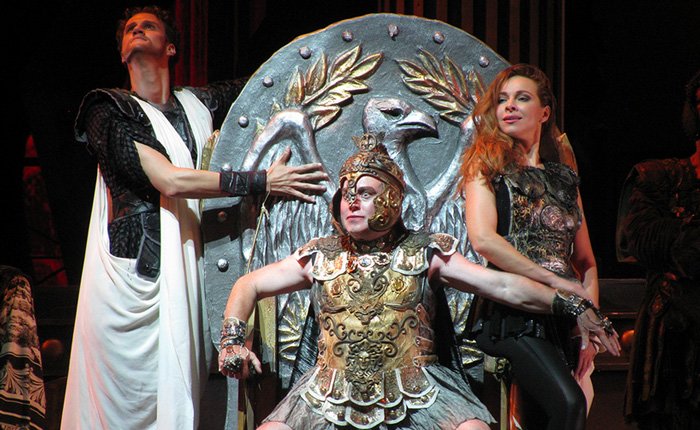 Так можно обозначить главную проблему спектакля. «Римская комедия» Моссовета о том же: меняются времена, одна эпоха сменяет другую, но суть взаимоотношений власти и интеллигенции та же — конфликт. Что в Риме I века, когда правил император Дамициан, окруживший себя толпой придворных лизоблюдов и конформистов, что 50 лет назад, что сегодня — в XXI веке.