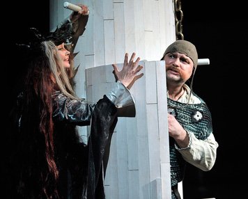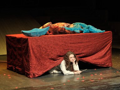 Несмотря на премьерные трудности, уже сейчас спектакль – воплощенная мечта любой классной руководительницы. Несложно предсказать, что к фоменкам потянутся бесконечные потоки “ашек” и “бешек”, желающих приобщиться к прекрасному. Текст поэмы избавили от некоторых лирических отступлений, длиннот и пикантных подробностей, которые могли бы принести “вред здоровью и развитию” детей, но пушкинский слог сохранили в целости, да и без радикальных интерпретаций, что ожидаемо, обошлись. При этом специфической театральной аудитории “12+” тоже постарались угодить: спектакль, при всей его классичности, местами получился очень смешной, вроде модных сегодня мультфильмов про богатырей. Чувственность двадцатилетнего Пушкина целиком сохранили. Тему плотской любви, такую животрепещущую для зрителя пубертатного возраста, затронули шутя: в первую брачную ночь Руслан и Людмила будут миловаться с неопытностью школьников, а неприкрытое сладострастье нежных дев, к которым случайно попадет хан Ратмир (та самая сцена, что так разозлила противников одноименной оперы Дмитрия Чернякова в Большом театре), легко компенсируется комизмом эффектной толстушки в парандже и кокошнике, возлежащей в бане в ожидании гостя.