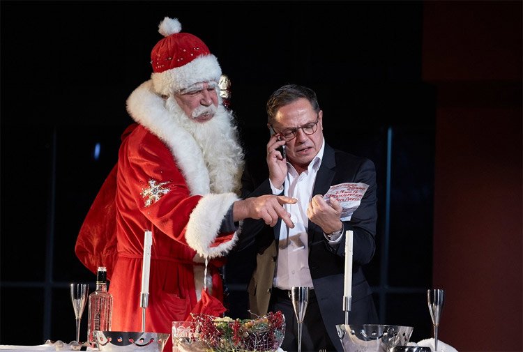 Сюжет этой бытовой истории Гармаша и Игоря Скляра спектакля С наступающим будет интересен всем зрителям, ведь у каждого в жизни могло произойти такое. Два давних товарища встречаются буквально за несколько часов до наступления Нового года. Первый из них – знаменитый телевизионный ведущий и продюсер Кирилл Цандер, а второй – никому не известный актер Михаил Громов, который подрабатывает на новогодних праздниках Дедом Морозом. И именно в этом образе он сталкивается на лестничной клетке со своим старым приятелем Цандером.