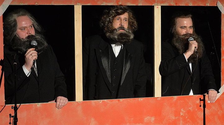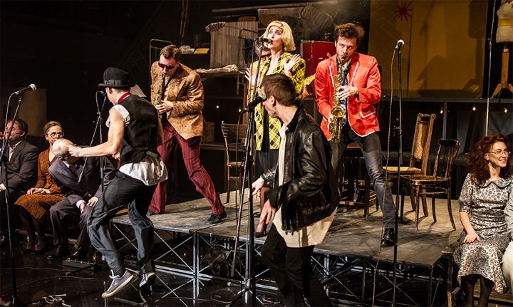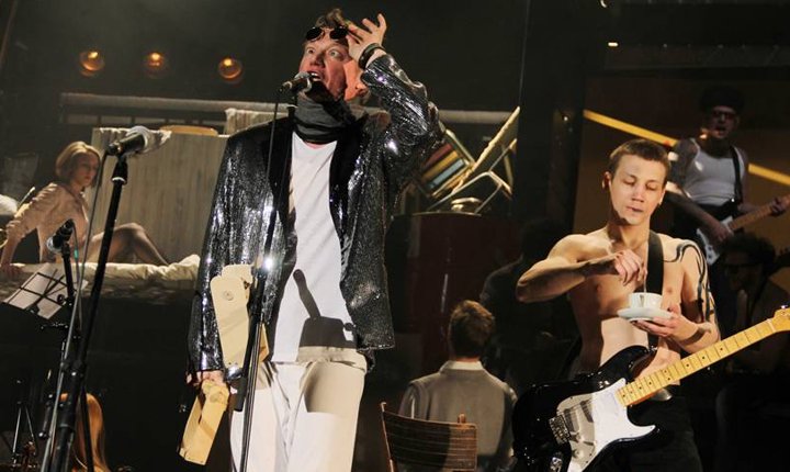 Но главная особенность постановки заключается в том, что режиссёр сумел объединить в ней разные эпохи российской истории, провести параллель между движениями протеста в царской России и рок-культурой 80-х, собрав на сцене МХАТ:
