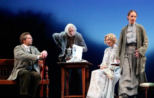 Этот "Вишневый сад" - продолжение "чеховианы" Кончаловского. В 1988-м он поставил "Чайку" в парижском "Одеоне", через 16 лет перенес ее на сцену Театра им. Моссовета. В 2010-м здесь же начали играть спектакль "Дядя Ваня", в 2012-м - "Трех сестер". Две последние постановки до сих пор в репертуаре и вместе с "Вишневым садом" составляют трилогию. Спектакли идут в одних и тех же декорациях. Так что зрителям уже знакомы и экран (теперь на нем переписка Антона Павловича с Ольгой Книппер-Чеховой), и качели, и "сцена на сцене" - деревянный подиум, который выглядит как беседка на воде. И здесь, внутри, действительно проходят все разговоры.