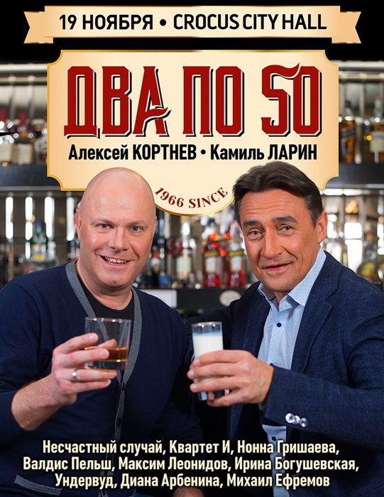 Знаменитому рок-музыканту, лидеру группы «Несчастный случай» Алексею Кортневу и известному актеру, заслуженному артисту Республики Татарстан, одному из основателей легендарного комического театра «Квартет И» Камилю Ларину осенью этого года исполняется 50 лет. Давние друзья и коллеги по сцене решили отметить юбилей вместе: праздничное представление назвали «Два по 50».