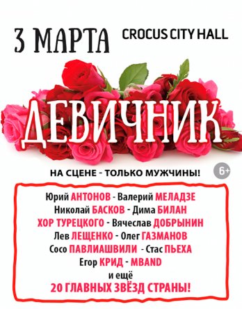 «Девичник» обещает собрать на сцене Крокус Сити Холла лучших артистов страны, героев отечественного музыкального телевидения. В концерте будут представлены все жанры, все направления, все звезды и лучшие песни в живом исполнении Иосифа Кобзона, Льва Лещенко, Николая Баскова, Олега Газманова, Хора Турецкого, Димы Билана, Сосо Павлиашвили, Александра Маршала, Стаса Пьехи, Михаила Боярского, Владимира Преснякова, Егора Крида, Витаса, Дмитрия Колдуна, Александра Олешко, Александра Буйнова, Марка Тишмана, Глеба Матвейчука, Евгения Кунгурова, Методие Бужора и многих других.* И все в этот вечер будет посвящено женщинам, и только им.