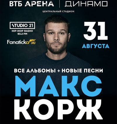 31 августа 2019 года «ВТБ Арена — Центральный стадион «Динамо» приглашает всех на концерт молодого талантливого рэпера из Беларуси! Макс Корж, билеты на которого мечтают купить тысячи поклонников, вновь едет в Москву! Его биты раскачают самую большую площадку столицы! Зрителей ждёт зажигательное шоу, в котором есть всё: бешеный отрыв, «лютый слэм» на танцполе, не прекращающийся ни на минуту, надувные матрасы или шары, летающие по залу, общий «медляк» под композицию «Вспоминай меня». Это будет самое грандиозное событие уходящего лета! Не пропустите: билеты на концерт Макса Коржа уже в продаже.