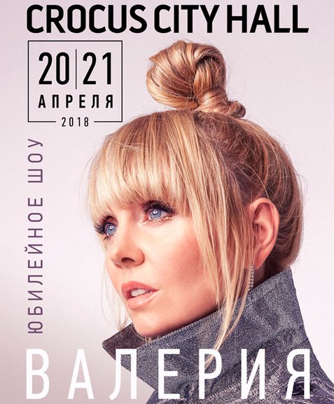 Народная артистка России, певица Валерия, выступит с большими сольными концертами 20 и 21 апреля 2018 года в Москве. Валерия не только исполнит свои самые известные хиты, но и удивит слушателей новыми песнями из готовящегося к выходу альбома.